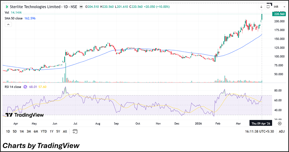 Sterlite Technologies Limited (NSE:STLTECH) gained 10.00% on 09 April, closing near INR 220.56, reflecting renewed buying activity alongside improved sentiment in digital infrastructure and telecom equipment-linked stocks. The sharp upward movement followed steady price consolidation in recent sessions and a breakout above short-term resistance zones.