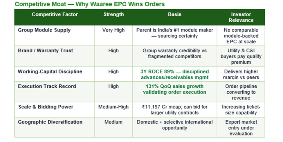 The company therefore benefits from two tailwinds at once: the volume tailwind in Indian solar capacity addition, and the group synergy of sourcing modules from its own parent at scale and on reliable schedule. The Waaree group brand has become a meaningful advantage. In a market where solar EPC is otherwise fragmented, backed-by-a-manufacturer EPC offers customers confidence on module authenticity, warranty enforceability, and installation quality. That trust dividend shows up in WRTL's ability to secure large-ticket orders from utilities, state discoms, and commercial & industrial buyers.
