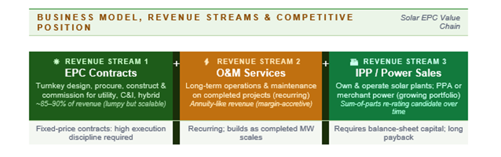 Primarily by executing turnkey solar EPC contracts — design, procurement, construction and commissioning — for utility-scale, C&I, and hybrid clients, plus long-term O&M revenue. A smaller but growing stream comes from owning solar plants and selling power under PPAs or on a merchant basis.