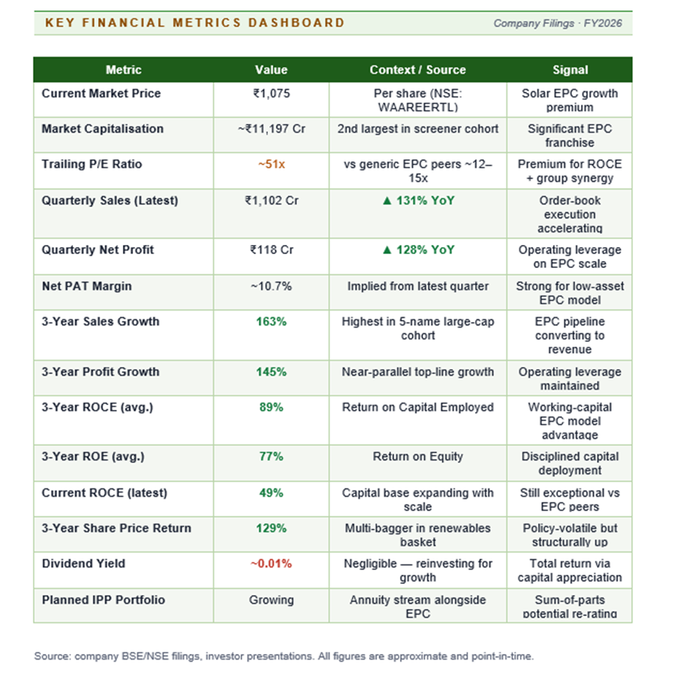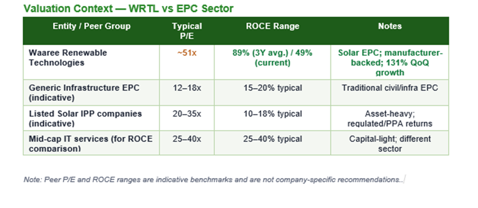 At ~51x trailing earnings, WRTL trades at a substantial premium to traditional EPC contractors, which typically change hands in the mid-teens. The premium is best understood as a blend of three factors: superior return ratios (ROCE near 50% versus 15–20% for generic EPC), sector tailwind (India 500 GW renewable ambition), and group vertical integration on modules.