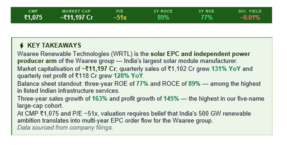 WRTL has been a prominent multi-bagger in the renewables basket over the past three years, with share-price return of 129% captured in data. The stock has also been among the more volatile in the basket, with sharp drawdowns whenever policy signals around anti-dumping duty, safeguard duty, BCD on modules, or ALMM norms have shifted. Investors should expect continued volatility as global module prices and Indian solar tariffs fluctuate.