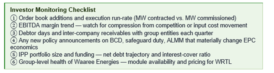 Order book additions and execution run-rate, EBITDA margin trend, debtor days, inter-company receivables with group entities, and any new policy announcements that materially change EPC economics. Company quarterly filings are the primary reference points.