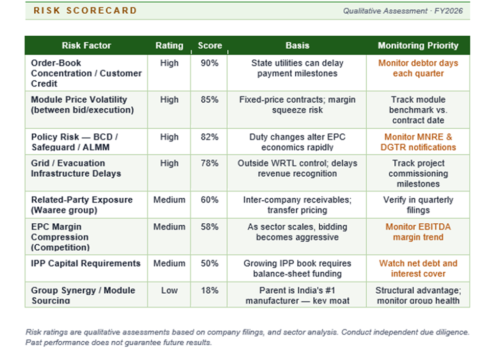 Execution and land-related delays are endemic to Indian solar. Right-of-way, evacuation infrastructure, substation readiness, and grid connectivity all sit outside WRTL's direct control but can delay commissioning, revenue recognition, and cash release.