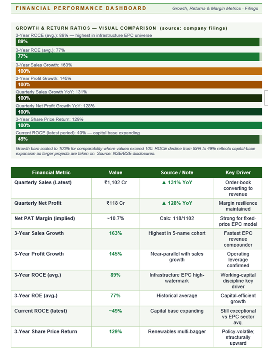 The reported numbers tell a compounder story. Quarterly sales of ₹1,102 Cr translate into an annualised run-rate well north of ₹4,000 Cr — several multiples of the base from three years ago. Net profit of ₹118 Cr in the quarter, up 128% YoY, implies net margins in the 10–11% range, which is strong for a low-asset-intensity EPC business, but consistent with an EPC outfit that captures both execution margin and the pull-through on group-sourced modules.