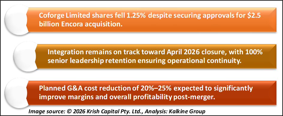 Coforge has secured all regulatory approvals for its Encora acquisition, clearing the path for closure by April 2026. Integration efforts, leadership retention, and cost optimization plans are progressing as outlined. While the deal aims to scale AI-led services, stock movement remained subdued. Execution of integration, cost targets, and market conditions will influence future performance and investor sentiment.