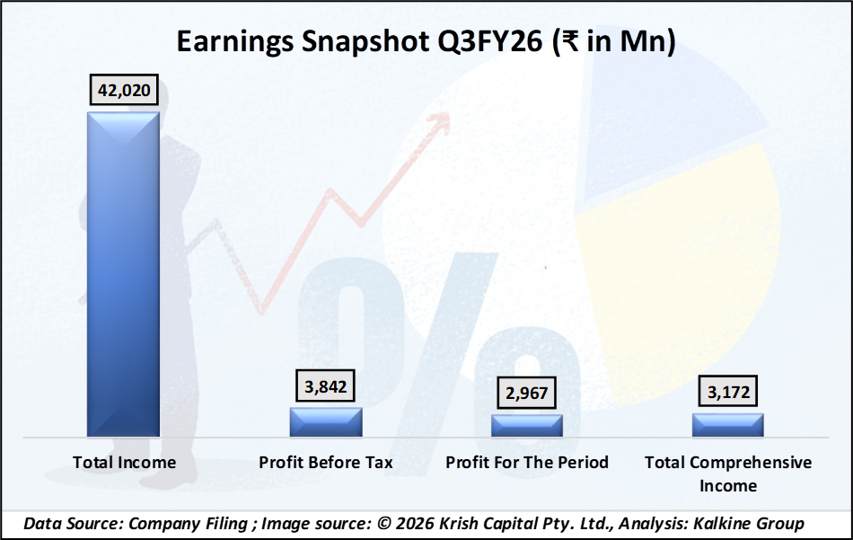 For Q3 FY26, the company reported a total income of ₹42,020 million. Profit before tax stood at ₹3,842 million, while profit for the period came in at ₹2,967 million. Additionally, total comprehensive income for the quarter was recorded at ₹3,172 million, reflecting the overall financial performance during the period.