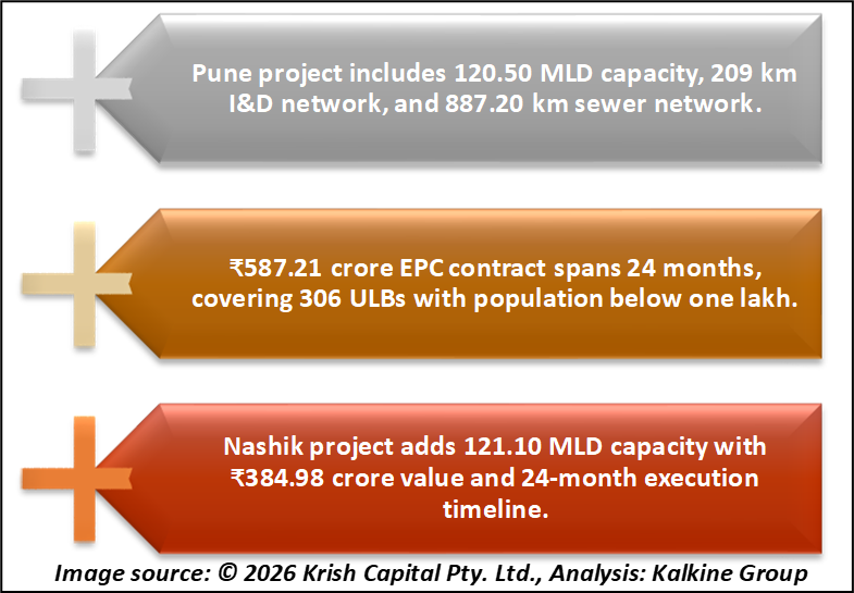 The first contract, awarded by the Swachh Maharashtra Mission Directorate, involves the development of 120.50 MLD sewage treatment plant (STP) capacity under Category-I Urban Local Bodies (ULBs) in Pune.