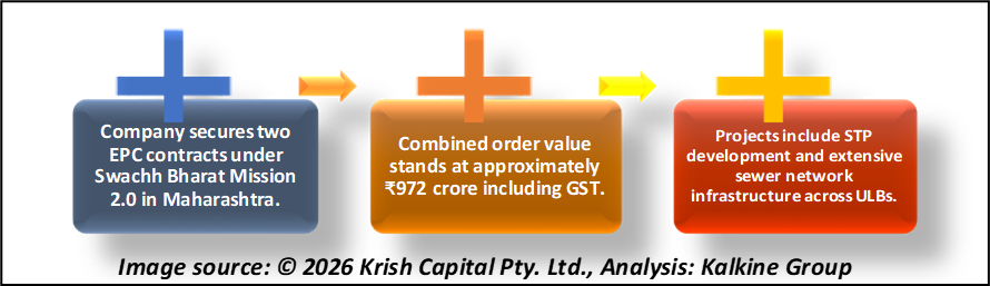 Enviro Infra Engineers secured two Maharashtra-based EPC contracts worth approximately ₹972 crore under Swachh Bharat Mission 2.0. The projects involve sewage treatment and sewer network development across multiple ULBs with a 24-month execution timeline.