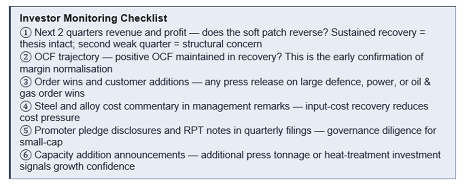 Third, qualify with high-value customers (power-equipment OEMs, defence prime contractors, oilfield equipment makers) where qualification cycles are long but customer stickiness is high once approved. Fourth, manage working capital and order-execution discipline to translate revenue into cash flow.