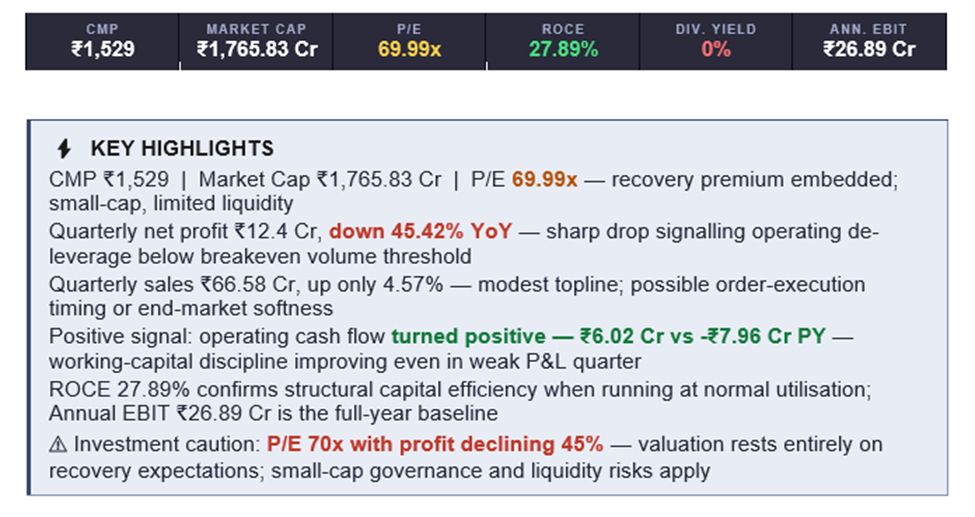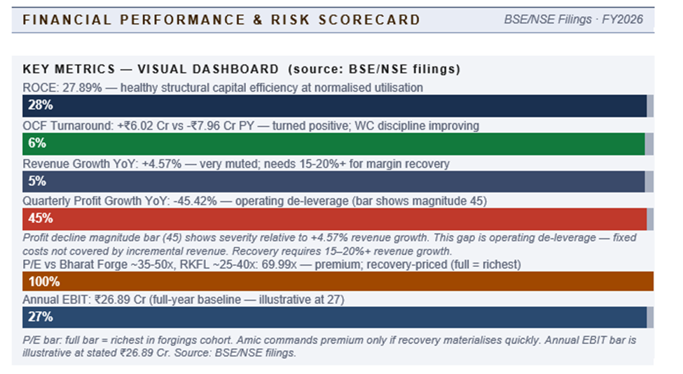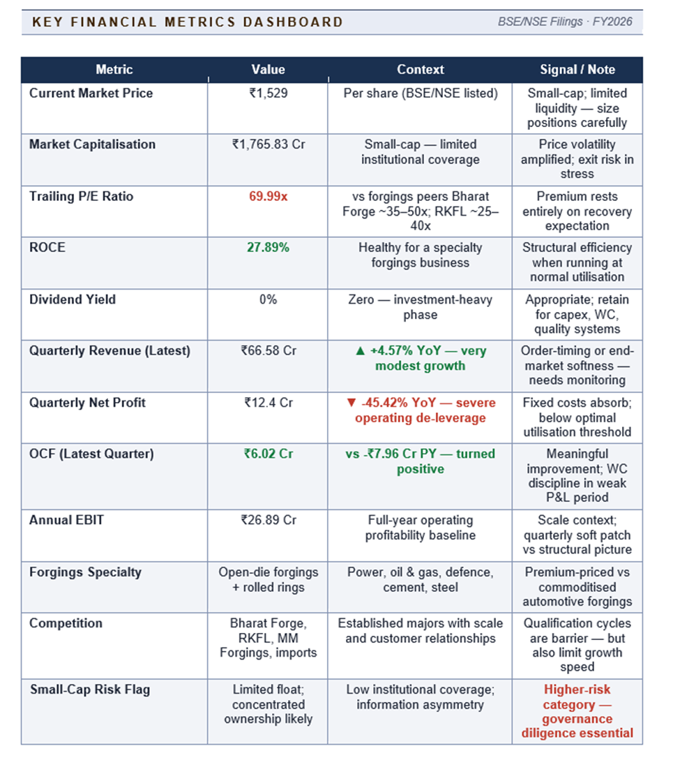The one bright spot: operating cash flow turned positive at ₹6.02 crore versus negative ₹7.96 crore in the prior year. For a small forgings business this is meaningful — it suggests working capital is being managed better even during a soft P&L quarter. ROCE of 27.89% remains healthy and confirms the business is structurally capital-efficient when running at normal utilisation.
