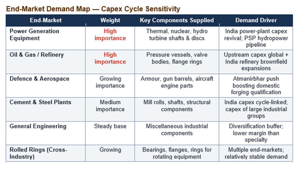 The forgings industry in India sits at the intersection of multiple capex-driven demand pools. Power-generation equipment, oilfield equipment, defence platforms, capital goods, and process industries all require large forged components — shafts, discs, rings, blocks — that smaller forgings shops cannot make. Players with the press capacity, heat-treatment infrastructure, and quality systems to serve these customers earn premium pricing and benefit from long-tenor relationships.