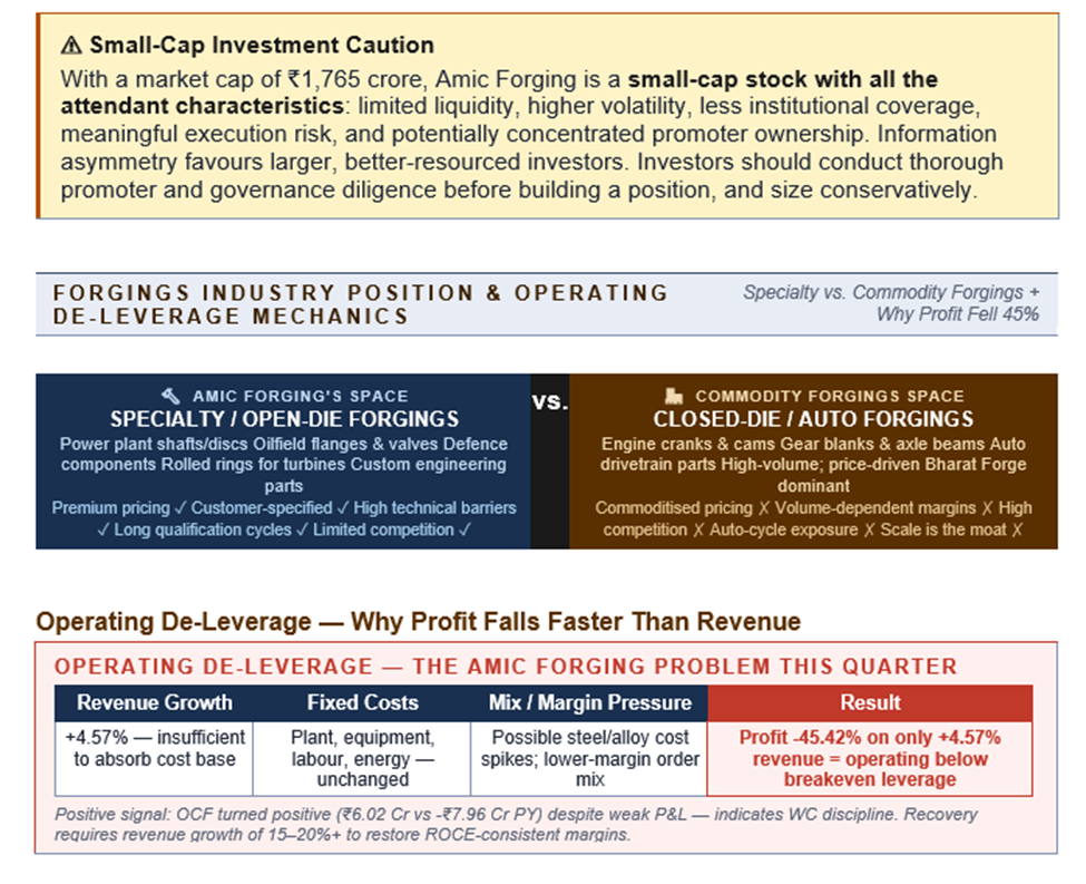 At a P/E of 69.99x and a market cap of ₹1,765 crore, Amic Forging is priced as if the latest quarter is an aberration and historic margins and growth will return. This is plausible but unverified. The bull case rests on specialty-forgings demand being structurally robust, the 27.89% ROCE pointing to underlying business quality, and the cash-flow turnaround as evidence of operational discipline. If revenue growth returns to 20%+ with margin recovery, the multiple becomes defensible.