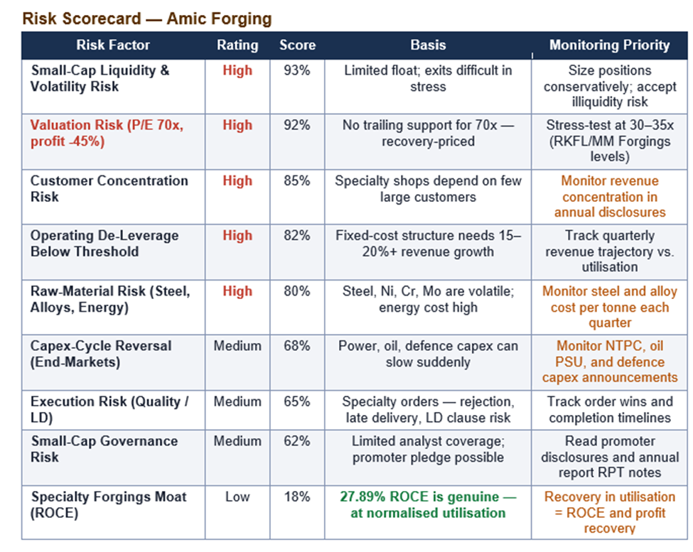 Small-cap liquidity and volatility, customer concentration, valuation risk at 70x P/E with falling profit, operating de-leverage below utilisation threshold, capex-cycle reversal in power/oil/defence end-markets, raw-material volatility (steel, alloys), execution risk on specialty orders, competition from established forgings majors, and small-cap governance considerations.
