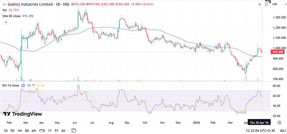 Godrej Industries Limited shows gradual recovery as price trades above the 50-day SMA near ₹915. Immediate support is placed near ₹940, followed by ₹900. Resistance levels are seen around ₹1,000 and ₹1,080. RSI near 60 indicates improving momentum, suggesting moderate upside potential if sustained buying emerges near resistance levels.