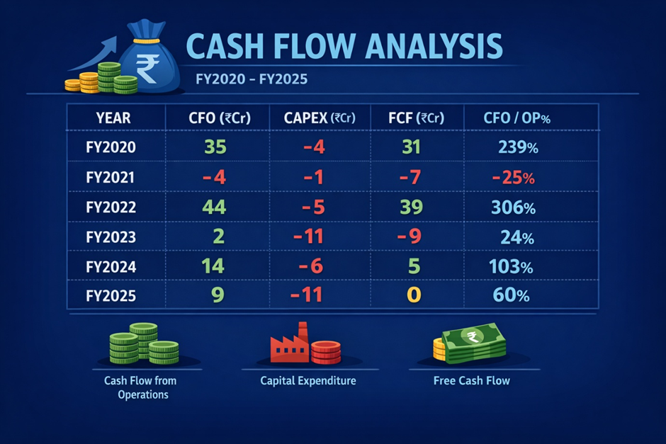The cash flow record is mixed. Operating cash flow has been positive in most years, and the CFO/Operating Profit ratio has generally been healthy — suggesting earnings quality is reasonable and profits are converting to cash. However, free cash flow has been volatile and marginally negative in FY2025, as modest capex investment absorbed operating cash generation. This is not a cash-generative business at scale — it is a tightly managed operation with limited surplus capital.
