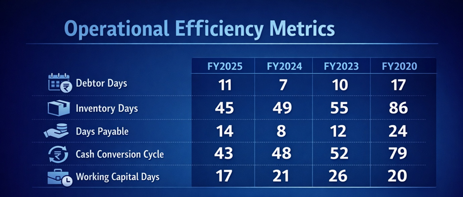 Debtor days of just 11 days in FY2025 is exceptionally tight for a B2B industrial manufacturer — it suggests Mahamaya's customers pay quickly and that the company has pricing and relationship leverage in its supply chain. The cash conversion cycle has improved from 79 days (FY2020) to 43 days (FY2025) — a 45% improvement reflecting genuine operational discipline. In an industry where working capital management is critical to profitability given thin margins, this is a real competitive advantage.