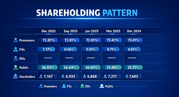 The shareholding pattern reveals a business almost entirely in promoter and retail hands. Promoter holding is stable and high at 72.81% — a positive governance signal but one that also means the effective free float is approximately 27% of shares, or just ₹411 Cr at current prices. DII (domestic institutional investor) holding is zero. FII holding, while rising from zero to 1.17%, remains negligible in absolute terms.