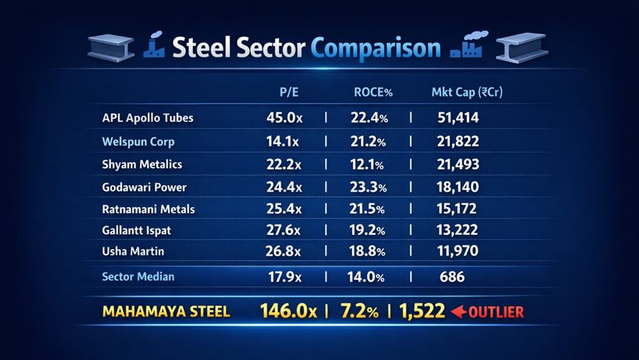The table makes the anomaly starkly visible. Every peer in the comparison group trades between 14x and 45x earnings and delivers ROCE between 12% and 23%. Mahamaya Steel trades at 146x and delivers ROCE of just 7.15% — the lowest in the group by a significant margin. It is paying more for less on every relevant metric.