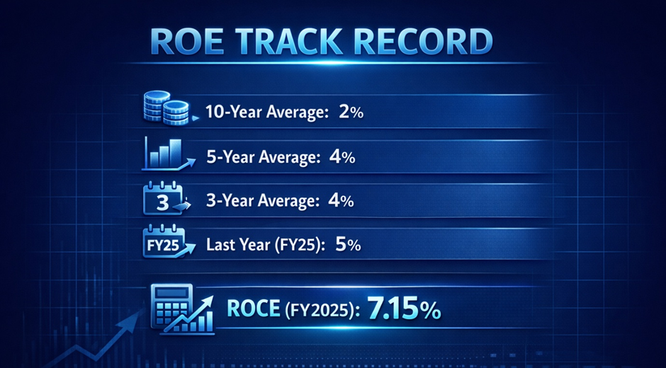A business that has generated an average return on equity of 2% over ten years and 4% over five years is not, by any objective measure, creating value for shareholders at the rate the market is currently pricing. The cost of equity for an Indian small-cap steel manufacturer — reflecting the risk premium required by investors — would typically be estimated at 14–18%. A business earning 5% ROE against a 14–18% cost of equity is destroying economic value, not creating it. This structural reality does not prevent share prices from rising — momentum, narrative, and liquidity dynamics operate independently of fundamental value in the short to medium term — but it establishes a clear ceiling on the valuation that can be sustainably supported by the underlying business economics.