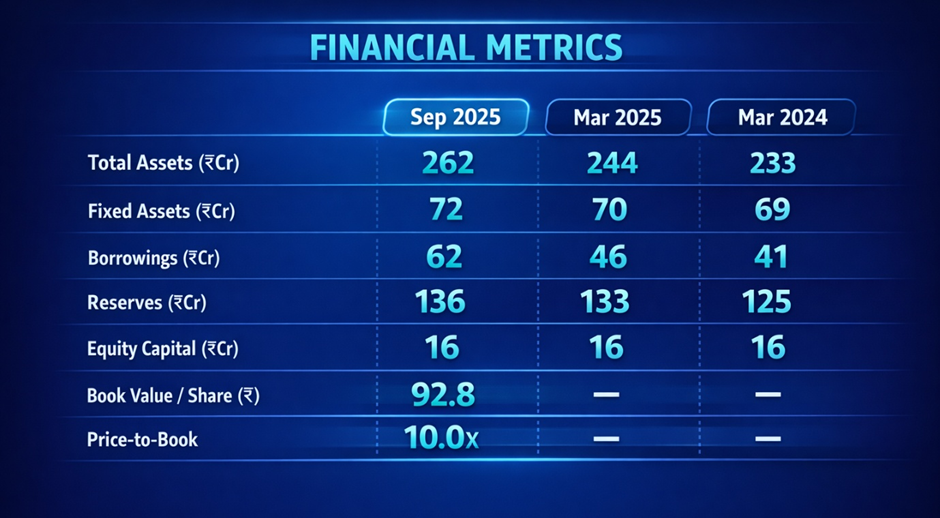 The balance sheet profile is that of a conservative, modestly leveraged business. Total assets of ₹262 Cr are small but stable. Borrowings have increased from ₹41 Cr (FY2024) to ₹62 Cr (Sep 2025) — a 51% increase that warrants monitoring but remains at manageable levels relative to the equity base. The company carries no significant financial distress risk.
