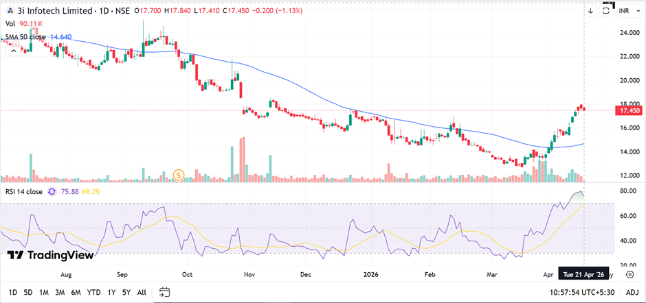 3i Infotech is witnessing a strong rebound with price moving sharply above the 50-day SMA, indicating bullish momentum revival. RSI near 76 signals overbought conditions, suggesting possible short-term consolidation. Immediate resistance is seen around 17.80–18.20, while support is positioned near 16.50–16.80 levels, maintaining a positive near-term bias.