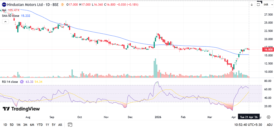 Hindustan Motors is showing a sharp recovery after a prolonged downtrend, with price sustaining above the 50-day SMA, indicating improving bullish momentum. RSI near 63 suggests strengthening momentum without extreme overbought pressure. Immediate resistance is seen around 17.20–17.50, while support is positioned near 15.80–16.00 levels in the short term.