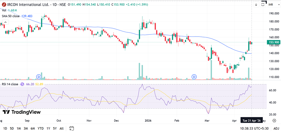 IRCON International is witnessing a sharp rebound after a prolonged downtrend, with price moving above the 50-day SMA, indicating improving momentum. RSI near 66 suggests strong bullish strength but approaching overbought territory. Immediate resistance is seen near 158–160, while support is positioned around 148–150 levels in the short term.