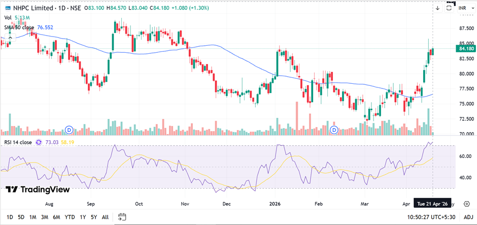 NHPC is witnessing a strong upward momentum with price breaking above the 50-day SMA, signaling a bullish trend continuation. RSI near 73 indicates overbought conditions, suggesting potential short-term consolidation. Immediate resistance is seen around 85–87, while support is positioned near 80–81 levels, maintaining a positive short-term outlook.