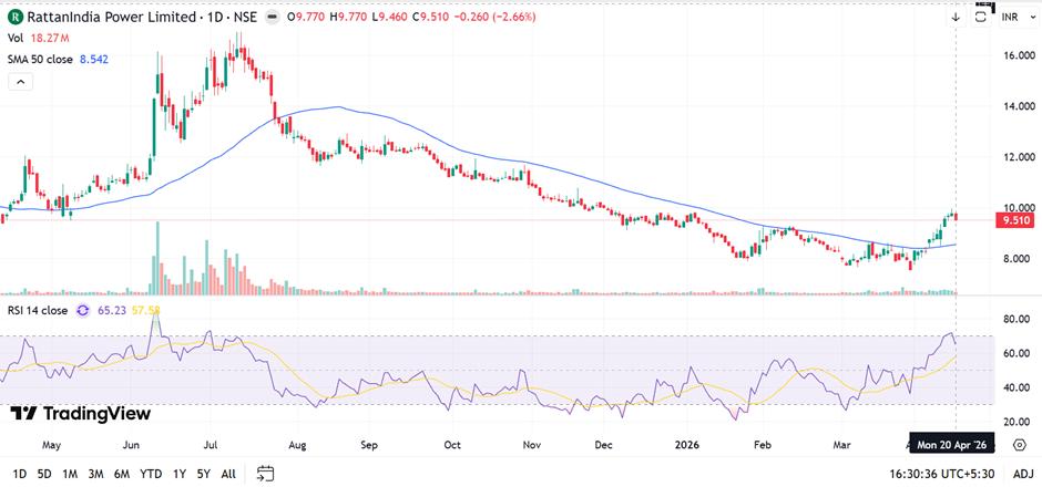 RattanIndia Power shows short-term bullish recovery, trading above the 50-day SMA near 8.54 after recent upward momentum toward 9.5 levels. RSI around 65 indicates strengthening momentum but nearing overbought territory. Immediate resistance is seen near 9.8–10.0, while support is placed around 9.0 and 8.5 levels.