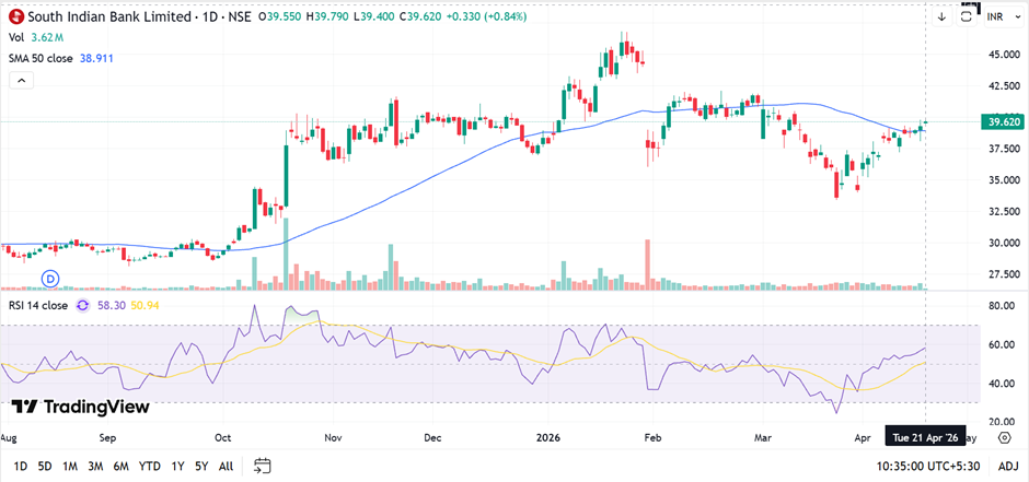 South Indian Bank is showing gradual recovery, trading near its 50-day SMA around 39, indicating improving short-term sentiment. RSI near 58 suggests strengthening momentum without overbought conditions. Price is forming higher lows after recent decline, with resistance seen near 41–42 and immediate support positioned around 38–39 levels in near term.