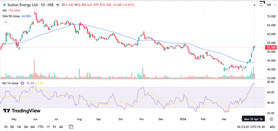 Suzlon Energy shows strong bullish momentum, trading above the 50-day SMA near 44.08 after a sharp breakout rally. Price around 52.5 approaches resistance near 54–55 levels. RSI near 76 indicates overbought conditions, suggesting possible short-term consolidation, while immediate support is seen near 48 and 45 levels.