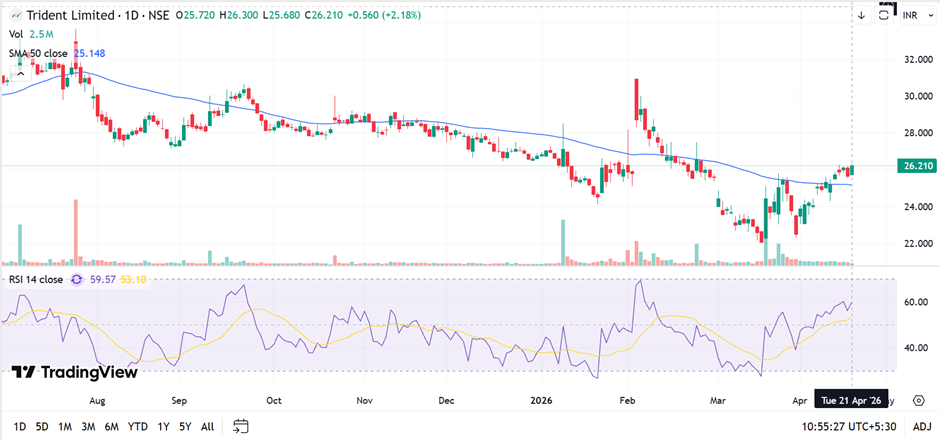Trident is showing gradual recovery with price reclaiming the 50-day SMA, indicating improving short-term bullish momentum. RSI near 60 suggests strengthening momentum without entering overbought territory. Immediate resistance is seen around 26.80–27.50, while support is positioned near 25.00–25.20 levels, maintaining a cautiously positive near-term outlook.
