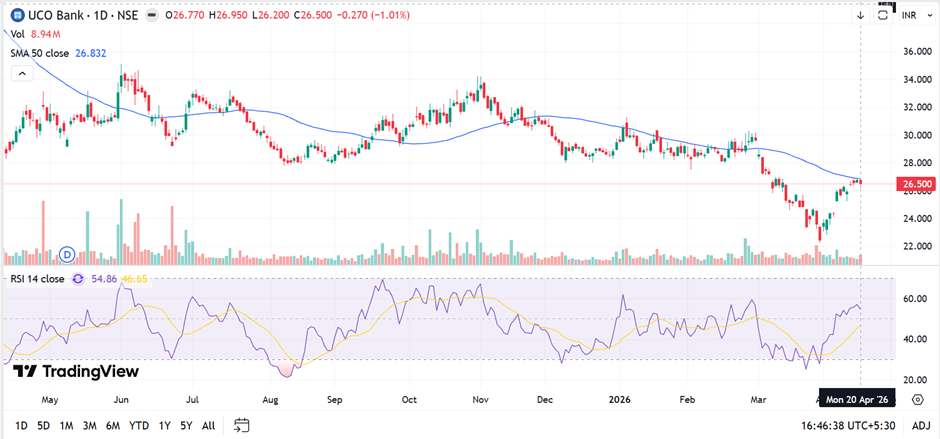 UCO Bank is consolidating near the 50-day SMA around 26.83, indicating a neutral short-term trend after recent recovery from lower levels. RSI near 55 signals improving momentum. Immediate resistance is seen near 27.5–28, while support is placed around 25.5 and 24 levels in the near term.