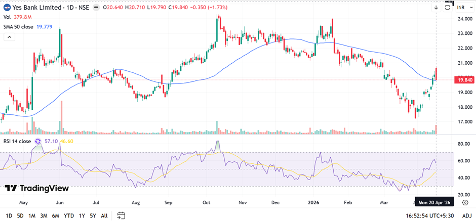 Yes Bank is showing short-term recovery, trading slightly above the 50-day SMA near 19.78, indicating improving momentum. Price around 19.84 faces immediate resistance near 20.5–21 levels. RSI near 57 signals strengthening momentum. Immediate support is seen near 19 and 18.2 levels, suggesting cautious bullish bias near term.