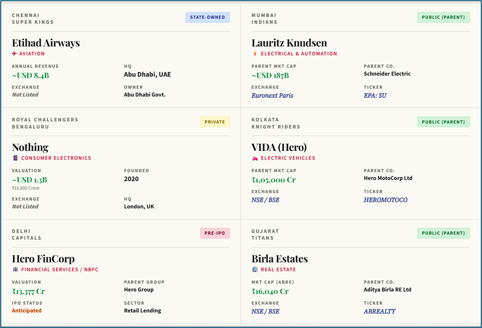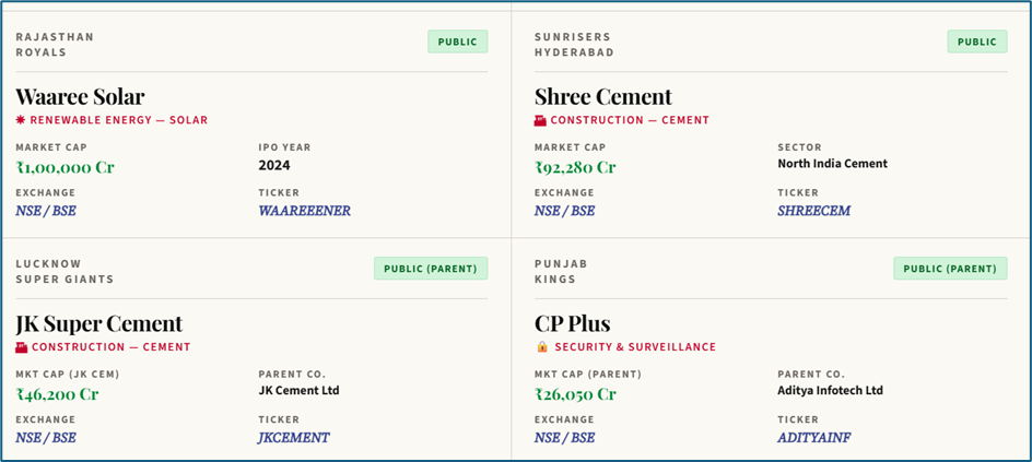 From the publicly listed Waaree Solar powering up Rajasthan Royals' campaign to the pre-IPO Hero FinCorp anchoring Delhi Capitals' chest, here is the complete picture — and what it means for investors.