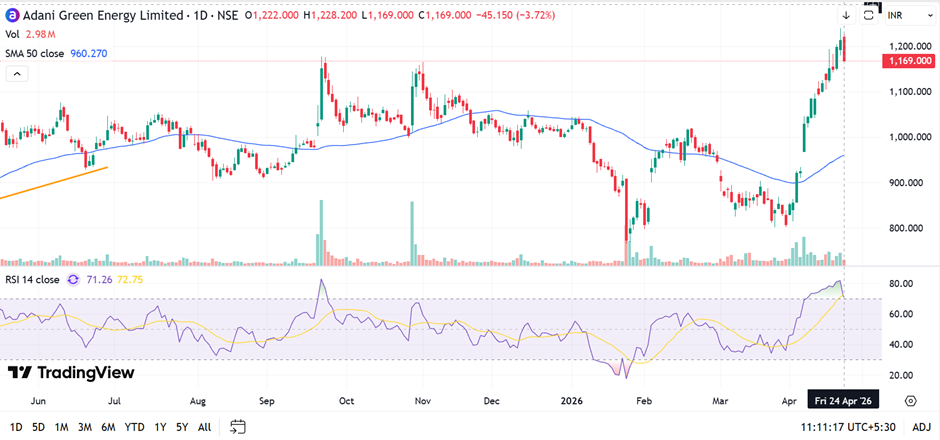 Adani Green Energy Limited shows strong bullish momentum after a sharp rally toward ₹1,220 levels, though recent profit booking has emerged. The stock remains well above the 50-day SMA near ₹960, indicating a strong uptrend. RSI near 71 suggests overbought conditions, with support at ₹1,120–₹1,140 and resistance around ₹1,220–₹1,240.