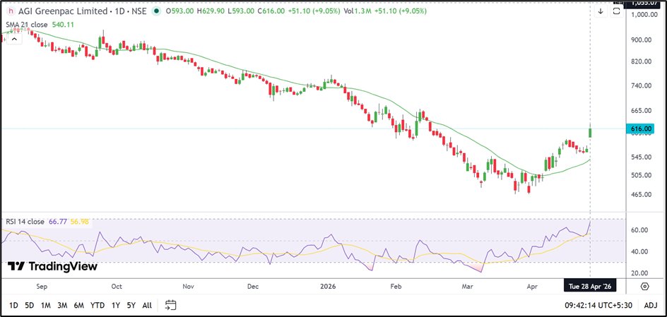 Technically, AGI Greenpac Limited is trading near ₹616.15 and has moved above its 21-day SMA around ₹540.11, indicating an improving short-term structure.