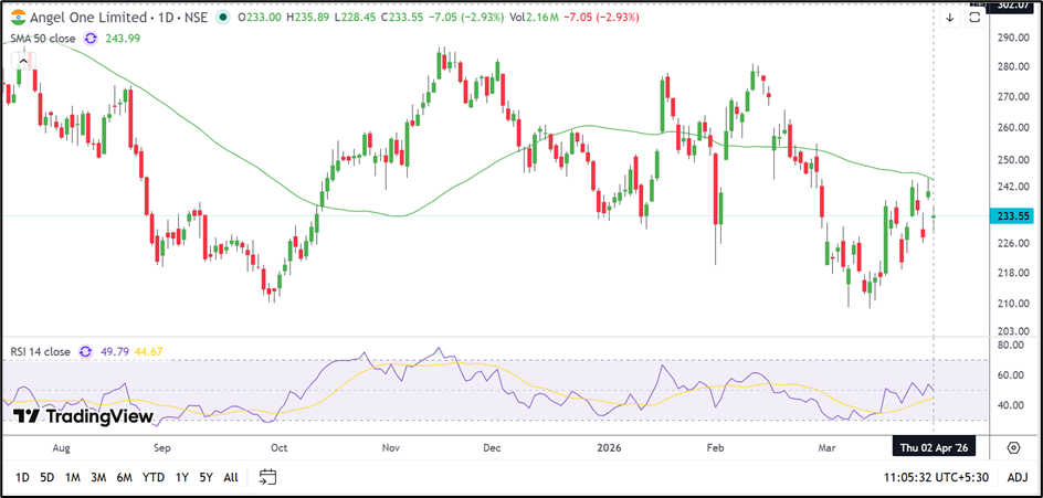 Angel One Limited (NSE: ANGELONE) declined 2.93% to INR 233.55 after facing resistance near the INR 240.00–245.00 area. The stock continues to trade below its 50-day moving average near INR 243.99, while RSI near 49.79 suggests that momentum remains balanced.