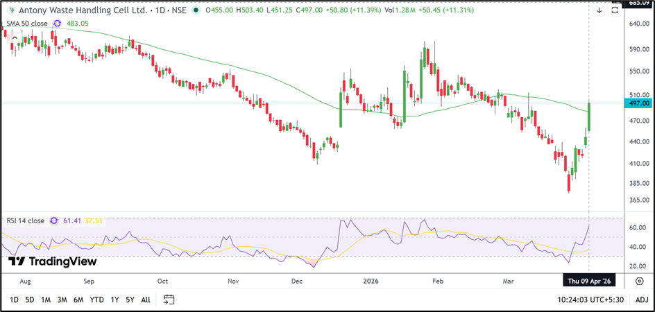 Antony Waste Handling Cell (NSE: AWHCL) has shown a notable improvement after reclaiming its 50-day average. The stock now appears stronger than it did a few weeks ago, although it may need to sustain above the recent breakout zone to keep the current momentum intact.