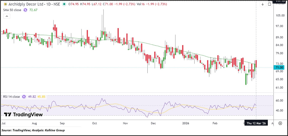 From a technical perspective, Archidply Decor Limited (NSE:ADL) is trading around ₹71.00 after declining about 2.73% on March 12, 2026. The broader chart structure indicates a gradual downward trend, with the stock forming lower highs over recent months. Price action is currently positioned below its 50-day Simple Moving Average near ₹72.67, which may act as a resistance level in the near term. Meanwhile, the 14-day RSI around 49.82 reflects neutral momentum conditions, suggesting the stock is moving without strong directional bias. Going forward, support may be seen near ₹65–₹60, while ₹77–₹82 could act as the next resistance zone if the price attempts a rebound.