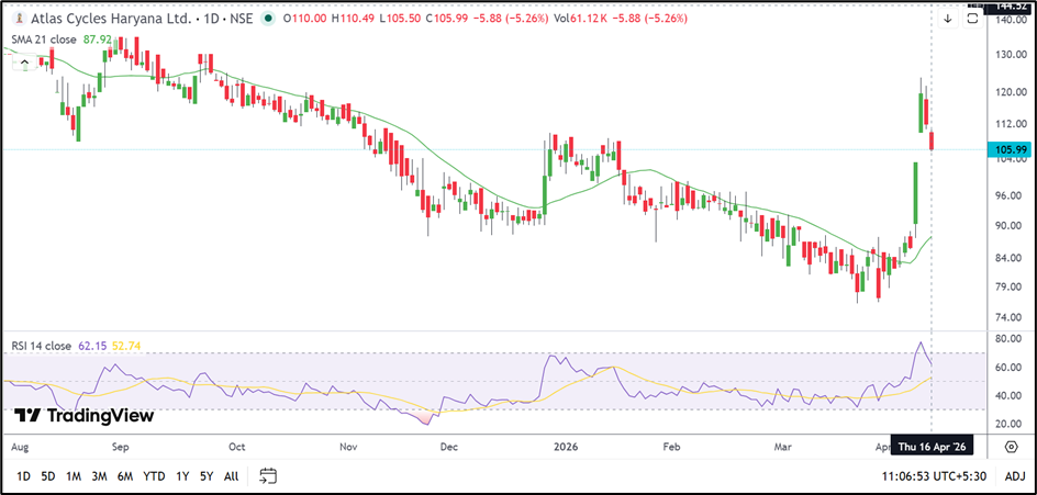 However, the latest candle shows that the stock is now slipping away from that peak and struggling to hold the higher levels. Even though Atlas Cycles remains above its 21-day Simple Moving Average near ₹87.92, the price has moved sharply lower from its recent top.