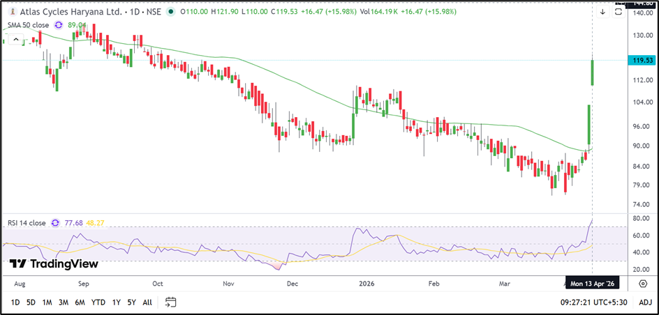Atlas Cycles (Haryana) Ltd (NSE: ATLASCYCLE) gained 15.98% to ₹119.53 on April 13 after opening at ₹110 and touching an intraday high of ₹121.90. The sharp move placed the stock among the top gainers of the session.