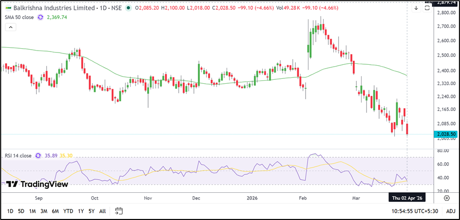 Balkrishna Industries Limited (NSE: BALKRISIND) declined 4.66% to INR 2,028.40 and continues to remain in a weak corrective structure below its 50-day moving average near INR 2,369.74. RSI near 35.89 suggests that momentum remains subdued, while the stock may continue to stay under pressure unless it reclaims the INR 2,150.00 zone.