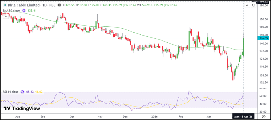 Birla Cable Limited (NSE: BIRLACABLE) gained 12.01% to ₹146.35 on April 13, 2026, after opening at ₹126.55 and touching an intraday high of ₹152.80. The stock remained among the top gainers of the session after extending the strong recovery seen over the last few trading sessions.