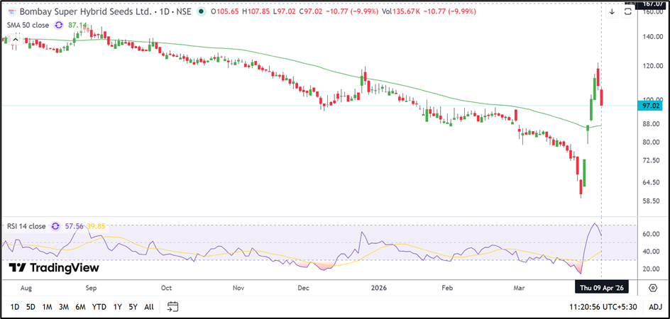 Bombay Super Hybrid Seeds (NSE: BSHSL) is currently trading near ₹97.02, down 9.99% in the session. The stock opened at ₹105.65 and moved briefly to an intraday high of ₹107.85 before witnessing heavy selling pressure through the day.
