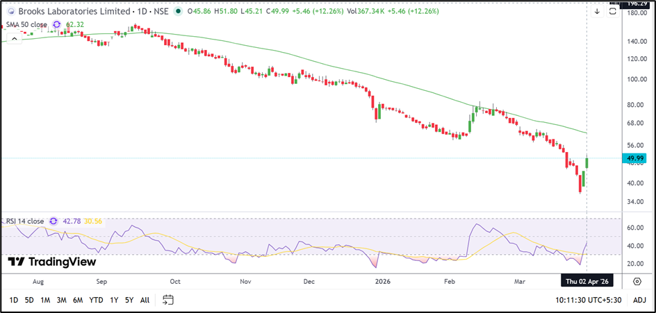 Brooks Laboratories (NSE: BROOKS) rose 12.26% to INR 49.99 after rebounding from recent lows. The stock remains below its 50-day moving average near INR 62.32, while RSI near 42.78 indicates that momentum is improving but still remains below neutral.