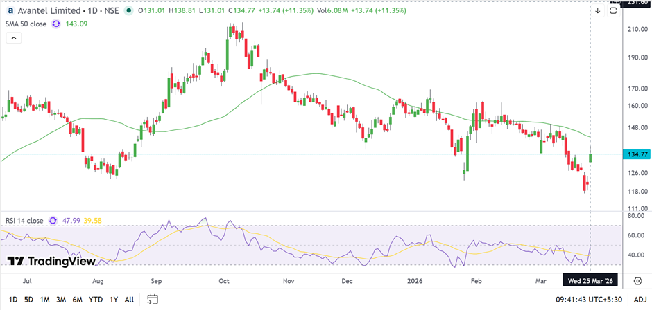 Avantel Limited is currently trading near ₹134.77 as of March 25, 2026, gaining around 11.35%, while still positioned below its 50-day Simple Moving Average near ₹143.09. The price structure reflects a prior declining trend, with the recent move indicating a recovery from lower levels.