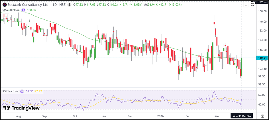 The broader structure in SecMark Consultancy remains mixed, although the latest session suggests an attempt to recover after the stock formed support near INR 97.00. The rally has pushed the stock to INR 110.24, slightly above its 50-day Simple Moving Average near INR 108.39.