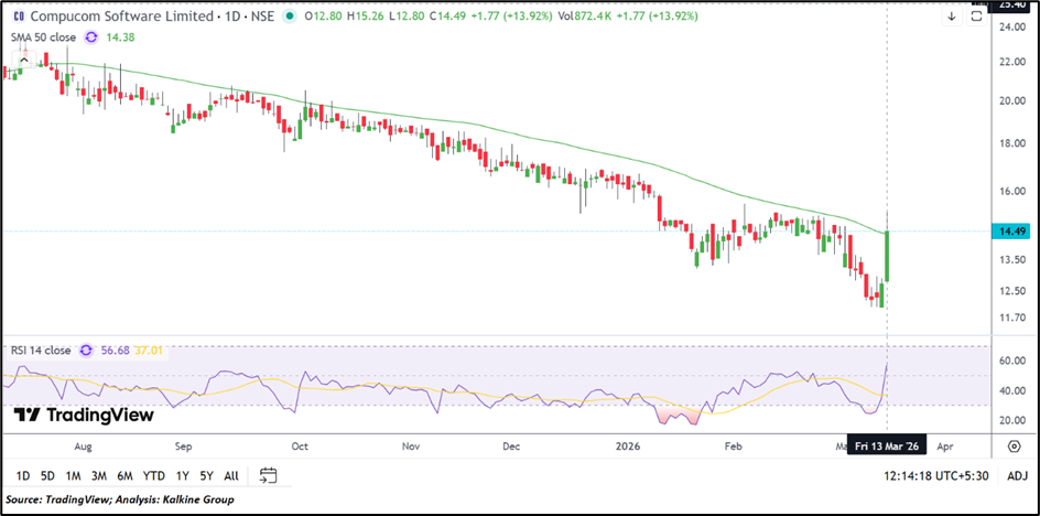 Compucom Software Limited moved higher, trading around ₹ 14.49 with a gain of about 13.92% on March 13, 2026, reflecting a notable recovery in price action on the daily chart. The stock is currently positioned close to its 50-day Simple Moving Average near ₹ 14.38, indicating a potential shift in short-term trend structure. The 14-day RSI near 56.68 suggests improving momentum following the recent rebound.