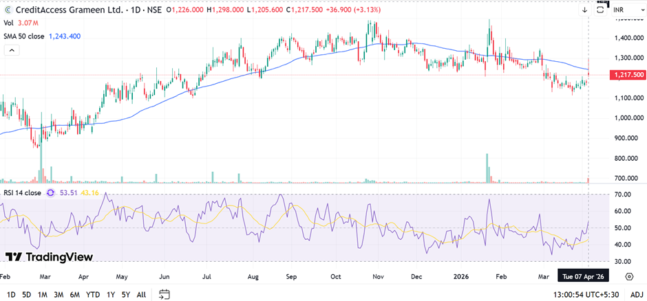 Technically, CreditAccess presents a more constructive picture than many of its peers. Crucially, the stock remains above its 200-day moving average — confirming that the long-term trend is intact. It is hovering near the 50-DMA, and the MACD is showing early signs of stabilisation. RSI is in a neutral-to-slightly-weak zone, suggesting neither overbought pressure nor distressed selling.